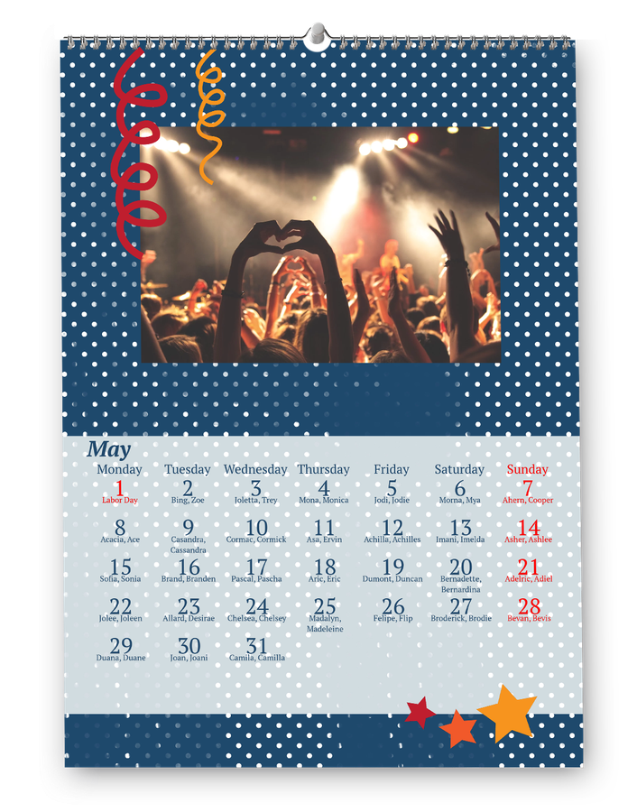 Create your own calendar: add birthdays, anniversaries and holidays, your favourite photos and start on the month of your choice. Our calendars are printed on top-quality paper and bound with a sturdy spiral binding.